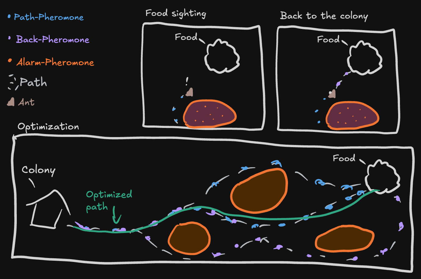 In a wide variety of situations, ants release so-called pheromones. As described above, these pheromones contain information in addition to their location. If, for example, a scout ant encounters danger, it releases an Alarm-Pheromone, which prevents other ants from entering that location when they sense it. Besides this obvious warning function, ants also use pheromones to find paths (which we can, of course, perfectly take inspiration from).
